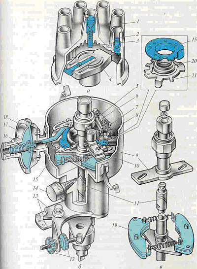 Прерыватель состоит из чугунного корпуса10, приводного валика 11, неподвижного опорного диска 21 и подвижного 15, кулачка 6, центробежного и вакуумного регуляторов опережения зажигания и октан-корректора.