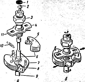 а – детали регулятора, б – действие грузиков, 1 – войлочная шайба, 2 – винт, 3 – кулачок, 4 – ведомая пластина, 5 – штифт грузика, 6 – грузики, 7 – ось грузика, 8 – ведущая пластина, 9 – валик прерывателя, 10 – пружина, 11 – вырез пружины.На валике 9 прерывателя жестко укреплена ведущая пластина 8 с грузиками 6, шарнирно установленными на запрессованных в пластину осях 7. сверху на валик надет кулачок 3, который удерживает от перемещения вверх винт 2, над которым в отверстие кулачка вставлена войлочная шайба 1. на выступы грузиков надета ведомая пластина 4. Вращение валика сообщается кулачку через ведущую пластину 8, грузики 6, их штифты 5, и ведомую пластину 4. При малых числах оборотов коленчатого вала грузики удерживаются пружинами 10 вблизи оси валика 9. С увеличением частоты вращения коленчатого вала, грузики регулятора расходятся. Каждому числу оборотов соответствует определенная степень расхождения грузиков. Штифты грузиков перемещаясь в прорезях пластины, поворачивают ее и соединенный с ней кулачок в сторону вращения ведущего валика на определенный угол, зависящий от числа оборотов. В результате кулачок раньше размыкает контакты прерывателя и угол опережения зажигания увеличивается. Угол опережения зажигания, достигаемый за счет действия центробежного регулятора опережения, составляет 0,2 – 0,25 рад (10 – 15 градусов).