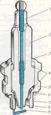 Свечи зажигания служат для образования искрового зазора в камере сгорания, где проскакивает электрическая искра.В стальном корпусе 5 помещен керамический изолятор 2, с центральным электродом 8. Изолятор зажат между медными кольцевыми прокладками 4 и укреплен путем завальцовывания верхней кромки корпуса свечи 3. В нижнюю часть корпуса запрессован боковой электрод 9. Нижняя часть центрального электрода и боковой электрод изготовлены из сплава никеля с марганцем. Между электродами должен быть зазор 0,6-0,8 мм, для его изменения нужно подогнуть боковой электрод. В корпусе свечи выполнена нарезная часть 7, по которой свечу ввертывают в отверстие головки цилиндров (резьба М14 х 1,25).Для уплотнения под заплечики ее корпуса ставят медноасбестовое уплотнительное кольцо 6. К наконечнику центрального электрода присоединяют провод с распределителя.