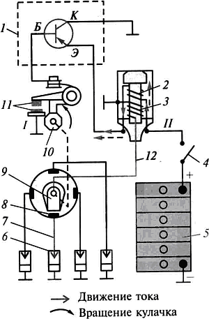 Помимо деталей и приборов, входящих в обычную систему батарейного зажигания, контактно – транзисторная система имеет транзисторный коммутатор1 и блок добавочных сопротивлений. Механический прерыватель управляет работой транзистора, подавая на него управляющий ток. Прерыватель контактно – транзисторной системы размыкает не первичную цепь системы зажигания, а цепь сравнительно слабого тока 0,75А управления германиевым транзистором, являющимся основной частью транзисторного коммутатора. В свою очередь транзистор прерывает более сильный ток первичной обмотки 2 катушки зажигания. Сила тока базы транзистора незначительна, при разрыве контактов износа от электрической искры практически не происходит, на срок службы контактов влияет только механический износ и поскольку контакты прерывателя разгружены от первичного тока, срок их службы увеличивается до 100 тыс. километров пробега и более.