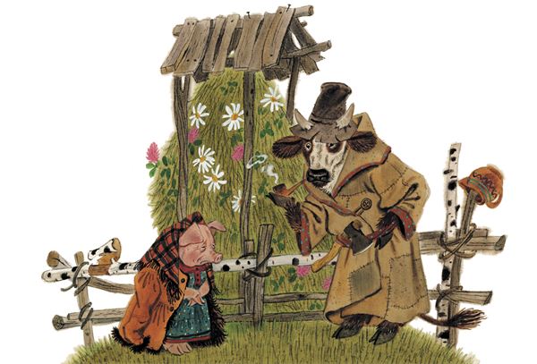 быком, а старуха твоя – свиньёй.Старик тут же обратился быком. Приходит домой и видит – стала его старуха свиньёй.