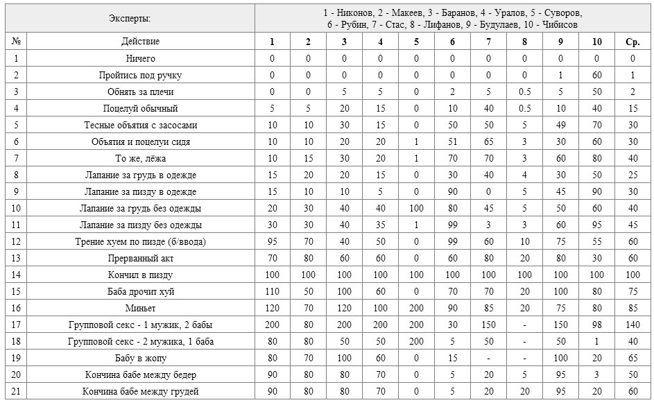 Обсуждение периодически прерывалось громогласным ржанием, слышным, я думаю, даже в коридоре и отмечающим удачные решения ареопага. Анкета предусматривала опрос как минимум десяти специалистов, ранжирование, рандомизацию и прочую хуйню из теории планирования эксперимента, которую нам читали то ли на 4 то ли на 5 курсе. Много споров вызвала единица измерения, точнее сама шкала. Степень кайфа от обычного полового акта с "кончиной" в пизду была принята за 100 баллов, а отсутствие ебли как таковой - за 0 баллов. Максимальный кайф было решено ограничить 200 баллами. Петя аргументировал это так: