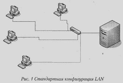 В настоящий момент Интернет является самой известной всемирной компьютерной сетью. Точнее, он является связующим звеном для большинства существующих сетей. Интернет состоит из миллионов компьютеров, связанных между собой с помощью общих стандартов и протоколов передачи данных. Протоколы позволяют пользователям всего мира обмениваться друг с другом информацией в различных ее проявлениях. Он включает в себя огромное количество локальных сетей (local-area networks – LAN), принадлежащих промышленным предприятиям, крупным компаниям, учебным заведениям и правительственным учреждениям. LAN – это группа компьютеров, связанных между собой непосредственно или через центральный компьютер, который называется сервером (server). Все эти компьютеры находятся на близком расстоянии друг от друга. Примеры локальных сетей можно увидеть в большинстве компаний мира. У каждого пользователя LAN есть свой рабочий персональный компьютер. Каждый пользовательский компьютер оснащен сетевой картой, тип которой зависит от конфигурации компьютера. Сетевая карта может находиться внутри компьютера (внутренняя), а может быть подключена к порту компьютера (внешняя). Связь между сетевыми картами (а, следовательно, компьютерами) и сервером (или серверами) осуществляется по проводам с помощью электронных устройств. На рис. 1 показана наиболее стандартная конфигурация LAN.