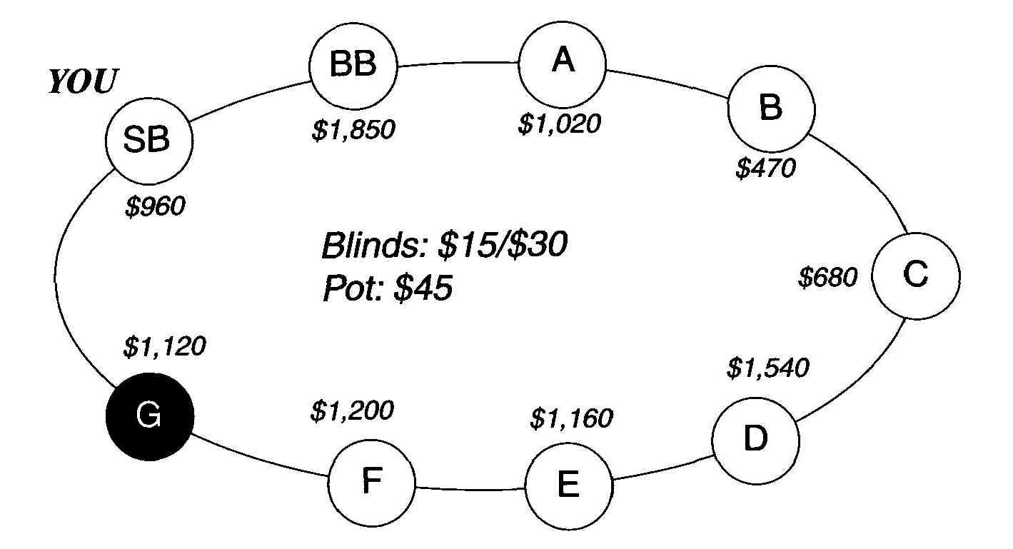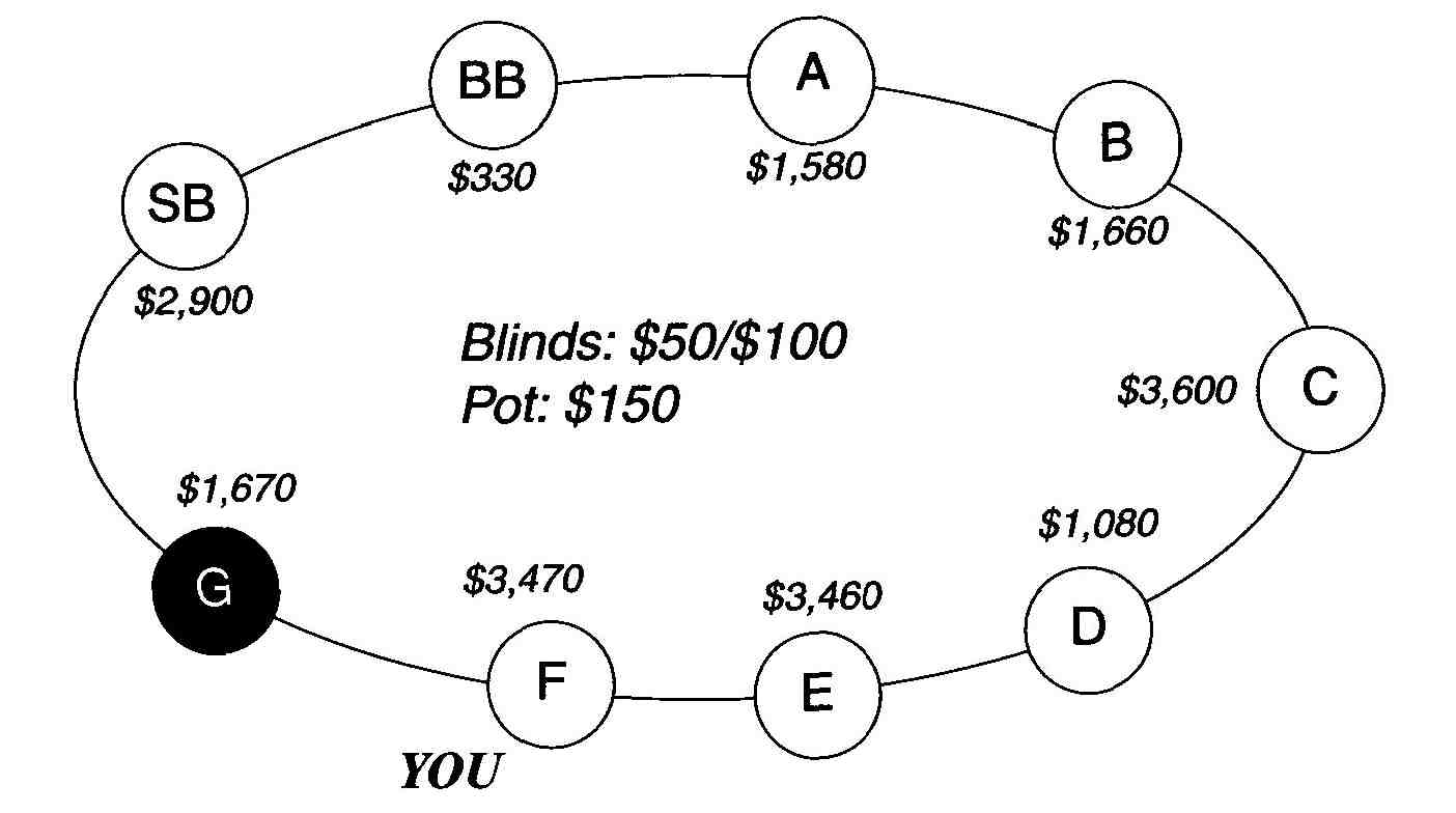 Ситуация: Крупный турнир, прошло несколько часов игры. Игрок Е лузовый и агрессивный, разыгрывает множество хэндов. Он открыл пару хэндов слабее среднего, но хорошо прикупал карты. Игрок G сверхтайтовый. Игроки. внесшие малый и большой блайнды похожи на серьезных игроков.