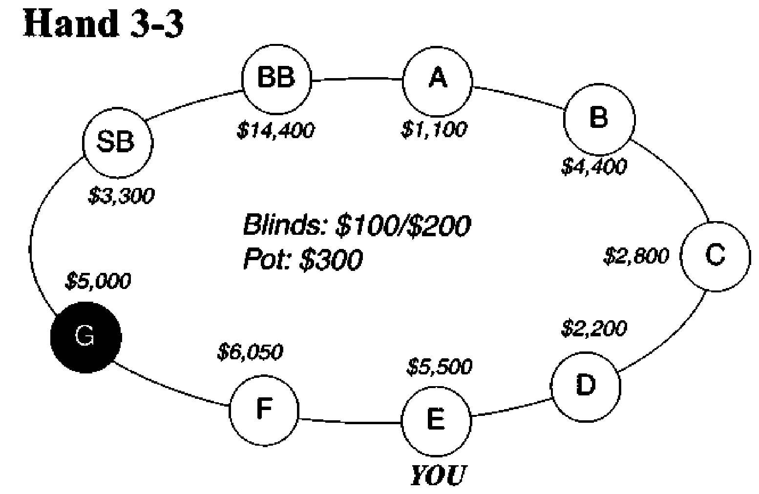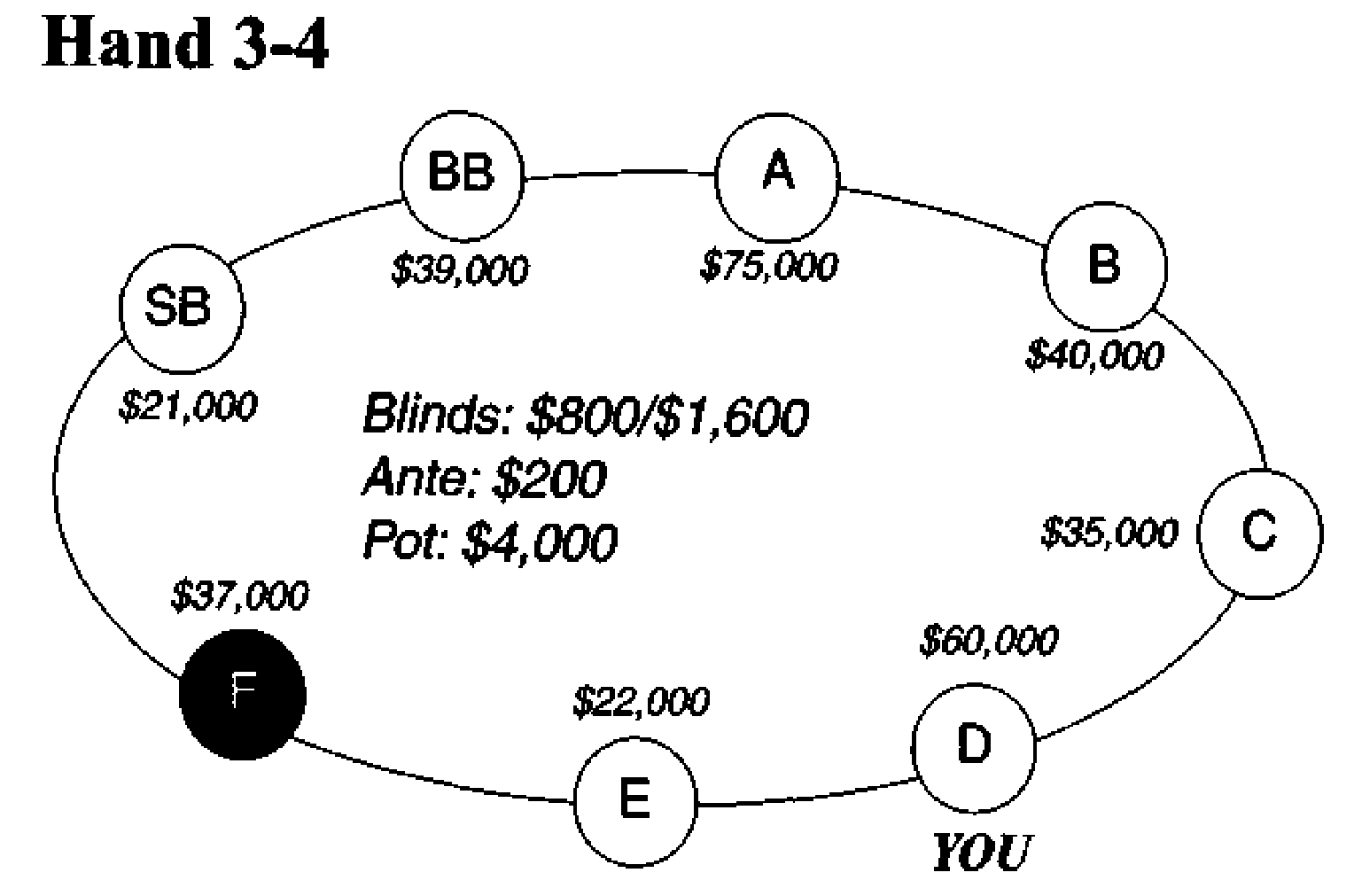 Действия: Вы поднимаете до 4000$. Игрок E сбрасывает. Игрок F поднимает до $10,000. Блайнды сбрасывают. Банк теперь 18000$. Уравнивание стоит Вам 6000$.