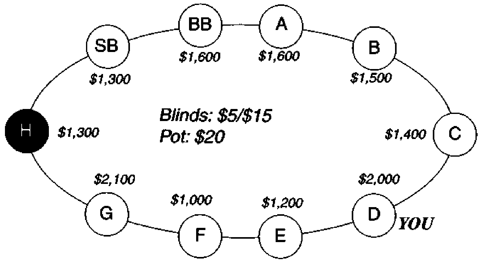 Игра до вас: Игроки А и В сбросили. Игрок С делает колл $20. Игрок D сбрасывает. Игрок Е делает рейз на $40. В поте сейчас $90.