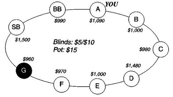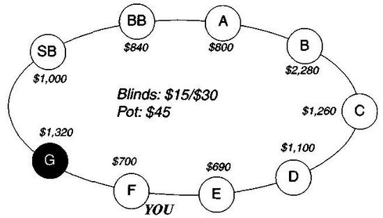 Ответ: Вам следует сделать здесь ставку приличного размера. Если у Игрока F есть девятка, вы побиты, но вряд ли у него она есть. Он серьезный тайтовый игрок, который, скорее всего, не будет отвечать коллом на рейз с хэндом туз-девятка или король-девятка. В этих мелких турнирах-сателлитах и онлайновых турнирах у вас очень мало времени для накопления фишек, поэтому нужно продвигать свои хорошие хэнды в полную силу. Вы не можете сильно переживать о дурацких хэндах с девяткой. Если вы получите рейз, планируйте отвечать коллом.