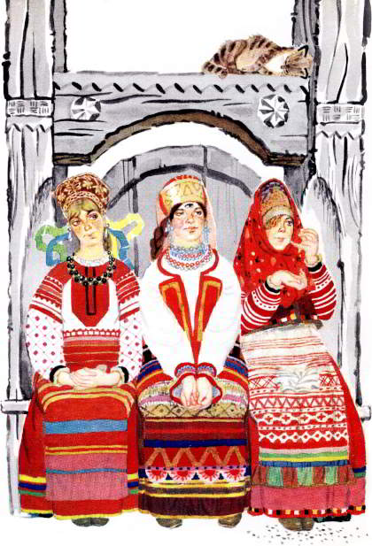 Дочери только и знали, что у ворот сидеть, на улицу глядеть, а Крошечка-Хаврошечка на них работала: их и обшивала, для них пряла и ткала — и слова доброго никогда не слыхала.