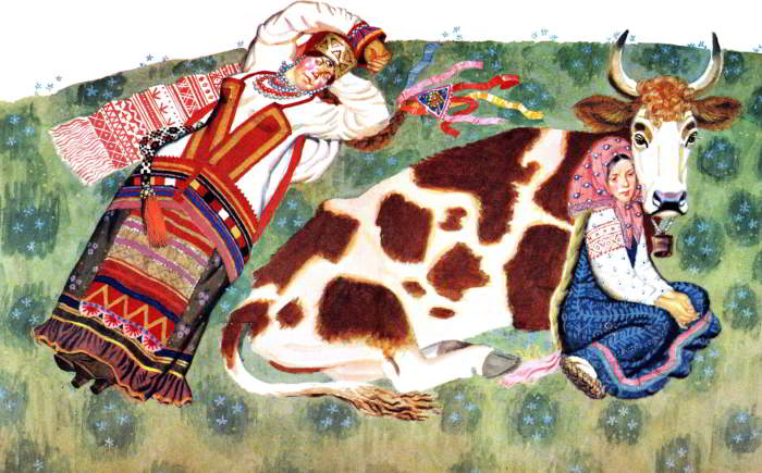 Два глазка у Триглазки заснули, а третий глядит и всё видит: как Хаврошечка корове в одно ушко влезла, в другое вылезла и готовые холсты подобрала.