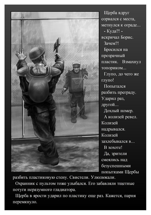 Щерба стоял сзади как вкопанный. Ему достался маленький, чем-то смахивающий на железный клюв топорик. Но будет ли прок от бывшего сослуживца? Парень, скалясь по-звериному, смотрел не на противников, высыпавших на арену. Щерба смотрел за арену. Сквозь прозрачный пластик – на зрителей. Щерба тормозил совсем не по делу.