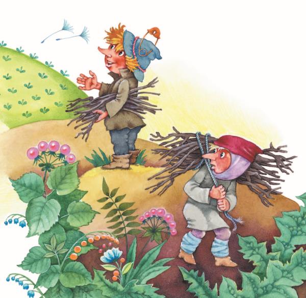 А Хёрбе как ни в чём не бывало отправился дальше. Дорожка, протоптанная гномами, привела его на дальний конец Ближнего леса. Там жили два гнома – Дитрих Корешок и Кайль Хромоножка. Они сидели на пороге и занимались делом. Дитрих, большой знаток трав и кореньев, толок в каменной ступе лепестки цветка арники. А столяр Кайль, которому в молодости берёзовым сучком повредило ногу, лущил лесные орешки.