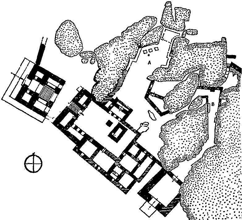 Известны еще четыре храма в южной части города. Три из них, по-видимому, были окружены одной храмовой стеной и стояли на естественных возвышениях над нижним городом. Если не считать отдельных деталей, все они довольно точно воспроизводили план главного храма (№ 1). У всех были церемониальные входы, центральные внутренние дворы с колоннадой и внутренними святилищами или алтарями с окнами, чаще обращенными наружу, а не во внутренний двор.