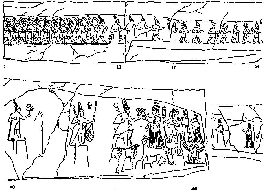 В первом, более обширном (помещение А)изображены две процессии — богов и богинь. Они как бы движутся навстречу друг другу, а главный бог и главная богиня, отмеченные особым своим положением и размерами, стоят друг перед другом в середине наскальной композиции. Почти в конце правой процессии изображен хеттский царь, тоже более крупным масштабом и отмеченный царским картушем с именем Тудхалии. За ним узкий проход, охраняемый крылатыми чудовищами с львиными головами, ведет в меньшее святилище (помещение В)— в узкий коридор с гладкими стенами, шириной не более 9 футов, с примыкающей подземной комнатой на глубине около 30 футов, в северо-восточном углу. Стена из циклопических блоков отделяет эту комнату от внешнего мира, оставляя по левую руку лишь узенький лестничный проход, где жрец мог один на один встречать любого, кто осмелился бы проникнуть в эту святая святых.