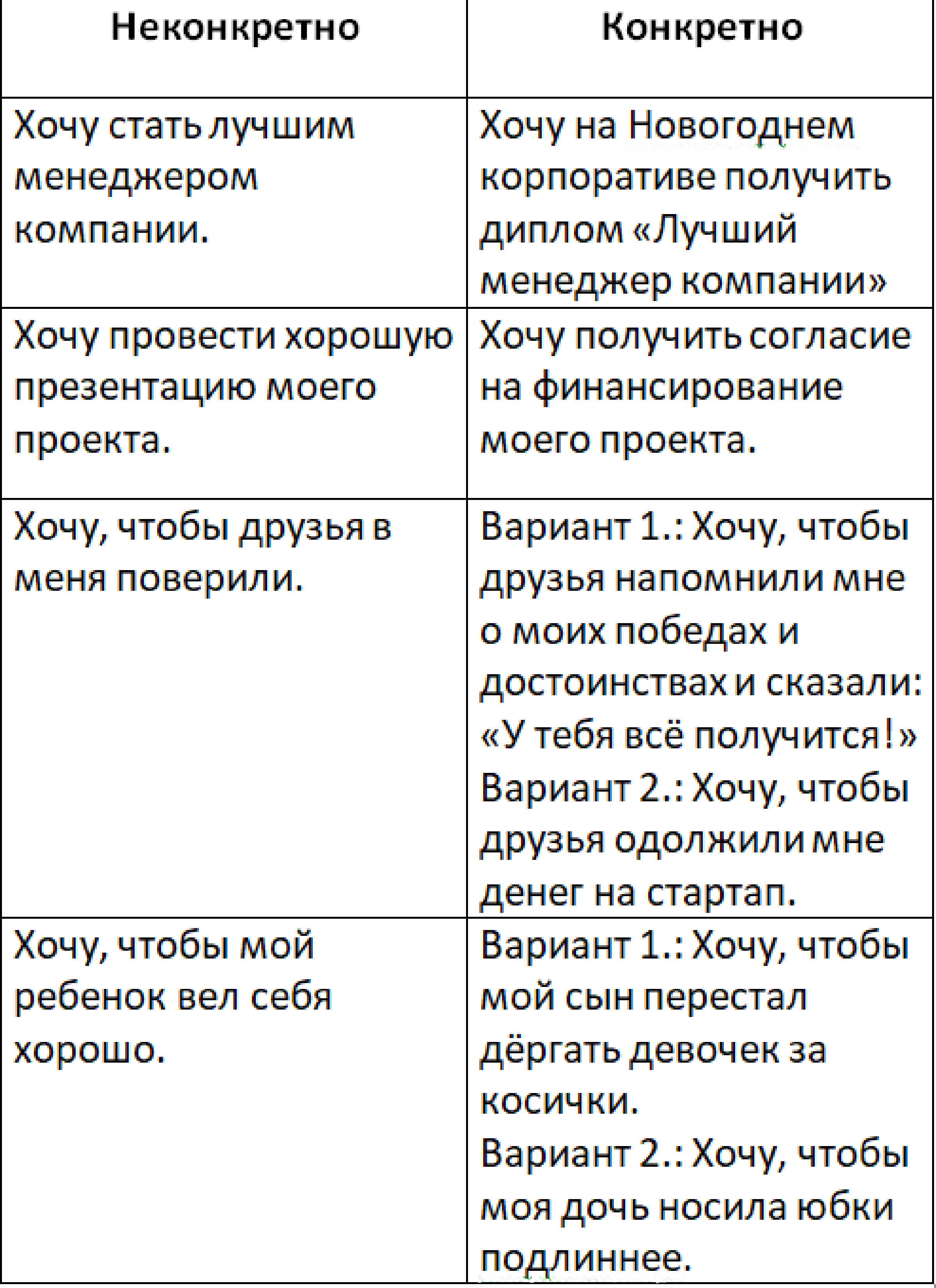 Так вот, если Вы свою цель можете представить в виде мини-фильма – ваша формулировка верна, если нет – не верна. Приведу ниже табличку с примерами.