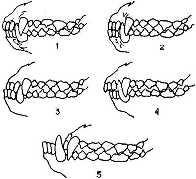 Кроме нормального, у собаки могут быть иные формы прикусов. При прямом или клещеобразном прикусе (рис. 2) верхние и нижние резцы при смыкании упираются друг в друга наподобие клещей. При данном прикусе режущие поверхности резцов быстро стачиваются. Заметных изменений в положении клыков и коренных зубов при таком прикусе обычно не наблюдается. Чаще всего клещеобразный прикус образуется при неправильном наклоне зубов. При перекусе (рис. 2), резцы нижней челюсти выдвигаются вперед, за линию верхних. Чаще всего это связано с неправильным наклоном нижних резцов. При резко выраженном перекусе клыки нижней челюсти выдвинуты вперед и стачивают задние стороны окрайков. При этом стачиваются также ложнокоренные и коренные зубы.