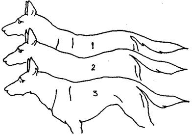 Спина. Спереди ограничена холкой, сзади поясницей. Хорошо развитая спина должна быть прямой и широкой. Прямая спина (рис. 3) обеспечивает лучшую передачу двигательных толчков от задних конечностей и амортизацию грудной клетки. Отклонением от нормы является провислая (рис. 3) или горбатая (рис. 3) спина.