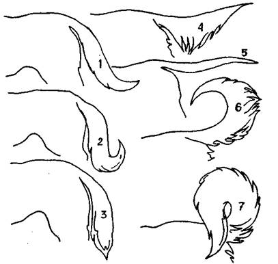 Форма хвоста. Является одним из характерных признаков породы. У большинства пород опущенный вниз хвост доходит до скакательных суставов. Хвост может быть коротким (не доходящим до скакательных суставов) и длинным (длиннее скакательных суставов). По форме хвосты собак делятся на поднятые и опущенные (рис. 4). Поднятые хвосты могут держаться кольцом (держатся на правой или левой стороне крупа, конец хвоста пересекает линию основания) или быть серповидными (держатся над спиной в форме серпа). Опущенные хвосты могут быть саблевидными, а также делятся на хвосты крючком, поленом, пером и прутом.