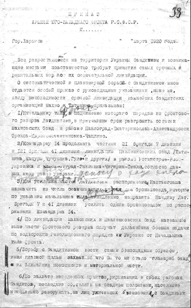 Проект наказу арміям Південно-Західного фронту від 7 березня 1920 р. з виправленнями рукою Сталіна (уривок).