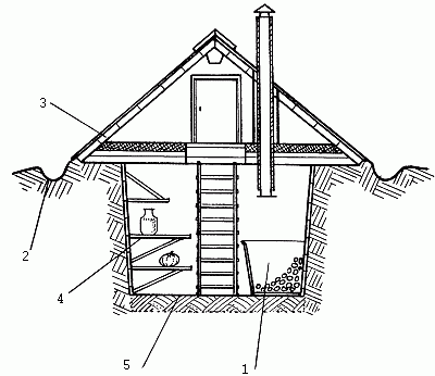 Рис. 1. Земляной погреб: 1 – закрома; 2 – водоотводная канава; 3 – скат крыши; 4 – полки; 5 – пол