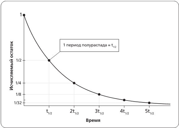 Рис. 6.4. Экспоненциальный распад радиоактивного источника. Один период полураспада – это время, необходимое для того, чтобы произошел распад 50 % образца. В течение следующего периода полураспада распадется 50 % того, что осталось. Таким образом, на горизонтальной оси, представляющей время на графике с периодами полураспада, мы видим, что по истечении пяти периодов полураспада остается лишь 1/2 – > 1/4 – > 1/8 – > 1/16 – > 1/32 образца