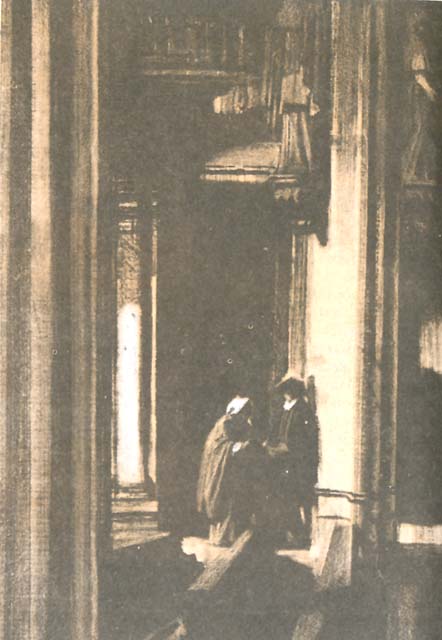 Внимание Бернара обратила на себя стройностью своего стана женщина, ехавшая в сопровождении двух лакеев на белом муле, которого вел под уздцы конюший. Ее платье, сшитое по последней моде, под тяжестью отделки оттягивалось вниз. Вероятно, она была красива. Известно, что дамы тогда выходили на улицу непременно в масках. Маска, скрывавшая лицо этой дамы, была черная, бархатная. Благодаря прорезям для глаз было видно или, скорее, угадывалось, что у нее ослепительной белизны кожа и синие глаза.