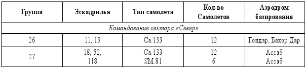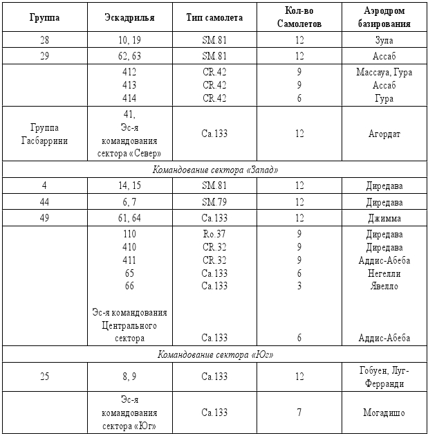 Военную авиацию колониальных войск возглавлял генерале Пьетро Пинна. Она включала в себя около 350 боевых самолетов, в основном устаревших конструкций. Многие из боевых машин, как, например, бомбардировщики Ca.133 и SM.81, принимали участие еще в эфиопской кампании середины 30-х годов. Нужно отметить, что из-за специфических погодных условий и сложностей с поставками запчастей в боевой готовности находилась только половина из этих самолетов. Общий боевой состав ВВС Италии в Восточной Африке без учета транспортных машин приведен в таблице ниже.