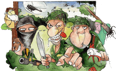 День 20. Обучались быть не только невидимыми, но и неслышимыми, так как были обвязаны колокольчиками. Под руководством мудрого сержанта и его пинков это получилось настолько неплохо, что у сержанта кто-то спер сигареты. Выяснили, что это сделал неуклюжий Васькин, умудрившись при этом скурить пол-пачки. Сержант этому факту удивился и начал ругаться на ниндзявском языке. Часа два мы добросовестно конспектировали его речь. Надо же знать, как правильно общаться с населением в тылу вероятного противника. В конце речи сержант пообещал устроить нам завтра сюрприз.