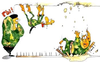 День 12. Ползаем неплохо, но часто падаем вниз. Сержант разложил внизу дощечки с гвоздями. Первым упал Иванов. Гвозди погнулись, Иванов почти не пострадал.