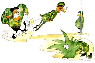 День 19. Обучались искусству быть невидимыми в тылу потенциального противника. Разбились по парам и играли в прятки. В роли арбитра выступил сержант, временами выделявший именной пинок. Нога у сержанта тяжелая, поэтому неудачники пролетали метров десять.