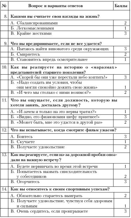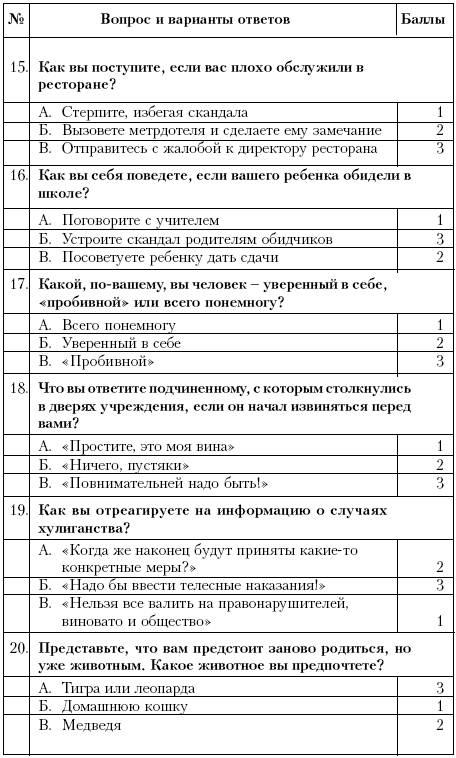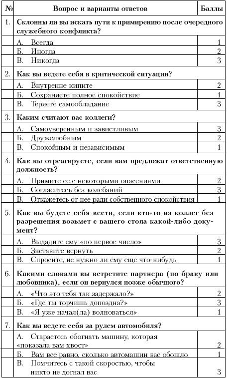 Флегматичный человек часто бывает скучен и неинтересен для окружающих, но и чрезмерная активность, переходящая в агрессию, никого не радует. Определите с помощью данного теста (стр. 73), достаточно ли вы корректны в отношениях с людьми и легко ли им общаться с вами. Для большей объективности ответов попросите кого-нибудь из ваших друзей, коллег или родственников ответить на эти вопросы вместо вас. Сравните результаты, и это поможет вам понять, насколько верна ваша самооценка. Из трех вариантов ответа выберите тот, который считаете подходящим для себя.