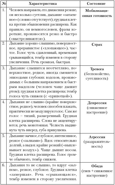 Страх проявляется общей мобилизацией организма для борьбы с опасностью, дыхание в этом случае автоматически задерживается, что связано с напряжением дыхательной мускулатуры в состоянии «готовности», «ожидания». Эта реакция имеет эволюционное происхождение, поскольку временная остановка дыхания (т. е. фактически «затаивание») позволяет животному скрыть от хищника свое местонахождение. Кроме того, в случае страха у человека напрягаются мышцы артикуляции и фонации, это заблокированный крик – отпугивающий врага или призывающий на помощь родителя. Вот почему у людей, находящихся в состоянии тревоги, часто меняется голос – чаще он становится более высоким. При депрессивных состояниях также происходит специфическое напряжение дыхательной мускулатуры – здесь мы имеем дело с подавленным плачем. Не трудно заметить, что человек, испытывающий горе, печаль или разочарование, говорит тише, что и является результатом соответствующей дыхательной реакции.