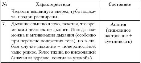 Кроме всех прочих характеристик целесообразно обращать внимание на смех человека, а также на его голос – все это самым непосредственным образом связано с дыханием. В случаях, когда человек мучается от затяжной тревоги, его смех неестественный, сдавленный, «сухой», часто, смеясь, человек закидывает назад голову. Человек, находящийся в депрессии, если и смеется, то делает это беззвучно, его грудная клетка не совершает «положенных» ей в таких случаях «экскурсий». Голос человека, испытывающего тревогу, кажется «гортанным» больше нужного, а у людей в депрессии голос словно бы «тает», «пропадает».