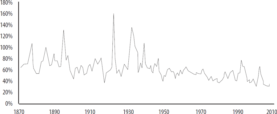 Следующий вопрос – коэффициент выплаты дивидендов из прибыли компании. Были периоды, например в 1932–1933 годах, когда компании платили аж 160 % своей прибыли в виде дивидендов. Как так, почему? Дело, конечно, в Великой депрессии. Кризис косил корпорации, но они продолжали платить высокие дивиденды! Они не хотели их снижать, чтоб не расстраивать акционеров. То есть выплачивали они даже больше, чем зарабатывали. Занимали, продавали что-нибудь ненужное и платили.