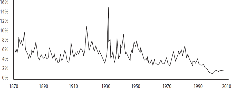 И четвёртая тенденция, про которую надо рассказать, – отношение дивидендов к цене акций. Вложили вы в акцию 100 рублей, а она вам принесла десять рублей за год – тогда дивидендная доходность у неё 10 %. В конце 19-го века типичное соотношение было 5 %, и это было хорошо, инфляция была низкой.