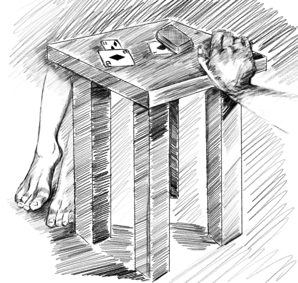 Юноша заметно приободрился. Он начал раздавать карты, периодически посматривая на Тату. Она задумчиво сидела на стуле, закинув ногу на ногу и опершись подбородком на руку. На ней была надета розовая майка и джинсовые шорты, на ногах ногти покрыты розовым лаком, в цвет майки.