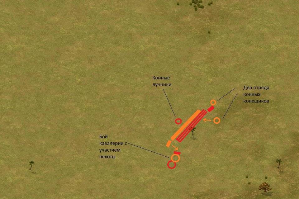 Было ровно одно наше соединение, которому приходилось легко — конные лучники сэйфов. Всадники-загонщики. Они спокойно зашли в тыл вражеской пехоте, начав обстрел. Противник позволил им это сделать. Учитывая примерный паритет сил, он не хотел выделять драгоценную конницу, чтобы гонять наших загонщиков. Шаддинский стратег считал, что те не сумеют нанести его пехоте критический урон, а он пока уничтожит наши фланги. Ну посмотрим.