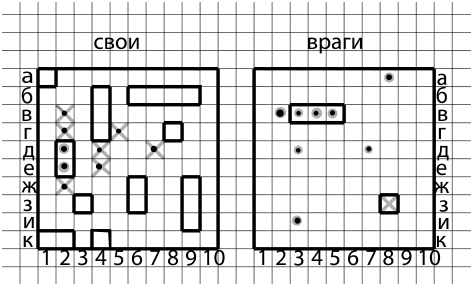 «Выстрелы» и потопленные корабли противника фиксируются на втором квадрате. На первом отображаются попадания противника.