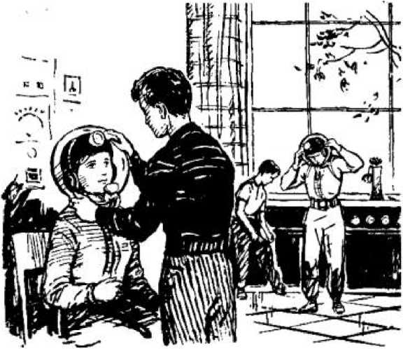 — Ну, хватит, — сказал Тима. — Теперь нужно шлем соединить с воротником костюма. Это тоже просто. Края шлема плотно прилегают к воротнику, герметически. Воротник, как видите, свободный — он не мешает поворачивать голову, и шлем тоже свободный. Он не будет мешать. На воротнике справа кнопка включения фонаря. Зажги, попробуй, Катя!.. Так. Проверьте, ребята, все ли у вас в порядке. Да, постойте! Главное чуть не забыл. Снимайте шлемы! Нужно ведь сначала надеть наушники.