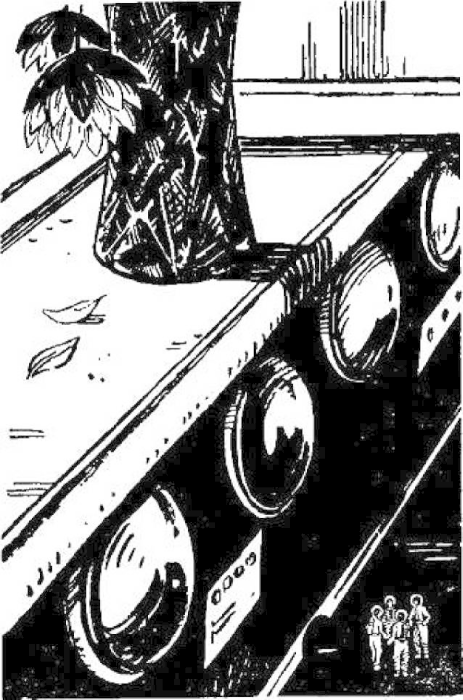 Тима молча кивнул головой. Он был озабочен — ведь нужно пустить в ход серебряную дорогу. Он знал, что на фотоэлемент, вмонтированный наверху арки, нужно направить дуло лучемета и нажать при этом на рукоятке одну из кнопок. Лучемет представлял собой генератор, дающий направленные волны-лучи различной длины, до самых жестких, мгновенно убивающих живые существа. И этот же лучемет, если нажать определенную кнопку, должен привести в движение серебряную дорогу — транспортер.