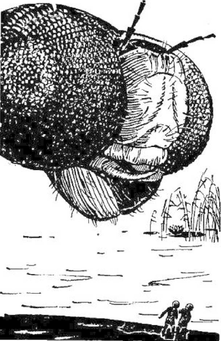 В уменьшителе это чудовище приняло самый невинный вид. Прозрачные крылья, длинные, покрытые волосками ноги. Продолговатое туловище. Удивительные глаза охватывают всю голову. Стрекоза могла смотреть одновременно во все стороны. И не так-то просто было добыче ускользнуть от ее внимания.