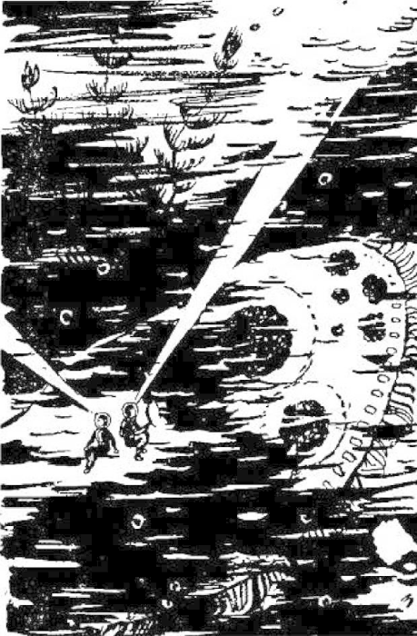 Сидя впереди, Тима держал в руках лучемет. Катя устроилась спиной к нему. Лучи фонарей ярко освещали им путь, хотя и без них было не так уж темно. Ведь пруд-то мелкий — солнечные лучи пронизывали его до дна. Однако с фонарями как-то удобней. И ребята решили их не гасить. Как только парамеция проснулась, Тима стал, как опытный шкипер, управлять ею. Послушная его воле, парамеция гребла своими веслами-ресничками. Тима попросил Катю, чтобы она внимательно смотрела по сторонам. Если завидит что-либо подозрительное, какое-либо животное, нацеливающееся на их парамецию, пусть тотчас же даст знать. С таким оружием, как лучемет, они не дадут себя в обиду.