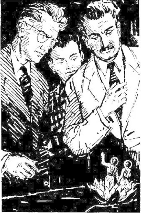 В лаборатории воцарилась тишина. Все молча смотрели на цветок. Стукнула входная дверь. Это был Борис. Он осторожно, на цыпочках, точно боясь разбудить кого-то, вошел в лабораторию. Остановился возле дверей. Никто не оглянулся. Все смотрели на черную плиту. Вот в глубине цветка стали заметны две точечки. Они росли, увеличивались… Вот они приняли уже очертания человеческих фигурок.