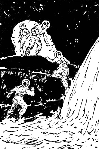Ван, вооружившись лучемётом, сел у входа в пещеру. Но скоро сон стал одолевать его; он вскочил и начал ходить взад и вперёд. Свет от фонаря плясал по пещере, и Ван залюбовался игрой искрящихся стен. Потом он остановился у входа. Внизу шумела вода. Ван невольно вздрогнул. Он подумал, каково бы им было, если бы не эта спасительная пещера.