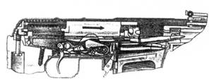 Винтовка Константинова относится к оружию с отводом пороховых газов, которые действуют на шток с коротким продольным движением. Запирание канала ствола производится поворотом затвора. Ударно-спусковой механизм куркового типа допускает ведение только одиночного огня. Флажковый предохранитель подпирает шептало спускового крючка и одновременно ограничивает движение затворной рамы назад. Экстракция стреляной гильзы осуществляется с помощью под- пружинного выбрасывателя, смонтированного в передней части затвора. Отражатель жестко закреплен на левой стенке ствольной коробки. Возвратная пружина расположена на направляющем стержне крышки ствольной коробки и упирается своим передним концом в дно отверстия стебля затвора. Магазин – отъемный коробчатый на 10 патронов, расположенных в шахматном порядке. По израсходовании патронов затвор останавливается в заднем положении на затворной задержке, что позволяет отсоединить пустой и присоединить снаряженный магазин.