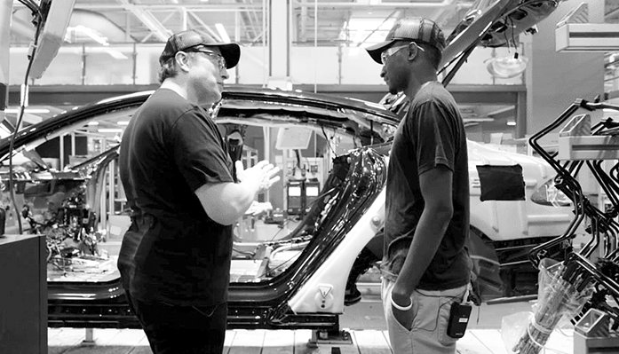 Фон Хольцхаузен и его заместитель Дэйв Моррис, который последовал за ним во Фримонт, порой ходили по цехам до двух часов ночи. Дизайнеру это было в новинку. “Это показало мне, как то, что создаешь на чертежной доске, влияет на работу на другом конце производственной цепочки, на сборочном конвейере”, – говорит фон Хольцхаузен. Маск проводил с ними два-три вечера в неделю. Он был нацелен на поиск первопричин. Что в дизайне вызывает проблемы на производстве?