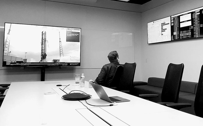Маск сидит в переговорной комнате “Юпитер” во Фримонте в 2008 году и наблюдает за запуском ракеты и производственными показателями Tesla