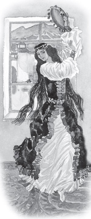 Молодой человек «по незнанию» оказался на женской половине дома. Смело шагнув через порог, он остановился у двери, глядя на растерянную девушку, которая, в свою очередь, окинув пришельца беглым взглядом с ног до головы, смущённо подняла руку, чтобы прикрыть лицо широким рукавом платья, из-под которого виднелись красные шаровары, украшенные золотистым галуном.