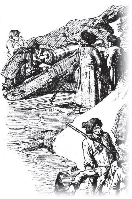 передвигались, выбирая места поудобнее. За ними гуськом, ведя на поводу лошадей, – кавалерия. За конными следовали сапёры и рабочие команды от всех батальонов во главе с инженер-полковником Миллером. Сапёры и строители расчищали тропы на косогорах и крутых спусках для пехоты, артиллерии и вьючного обоза. Двигались иногда ползком над тёмными пропастями, нитью, держась друг за друга, то поднимаясь на вершины поднебесных кряжей, поражающих взоры заоблачным видом, вечными снегами ослепляющей белизны, то упираясь вытянутыми ногами в каждый уступ, скользили вниз, поддерживая друг друга и животных.Это было в последние дни августа. Дождь, преследовавший от Кази-Кумуха до Дульты-Дага – первого отрога Главного хребта, – сменился густым молочно-белым туманом. Трудно было солдатам, но ещё труднее стало проводникам, которые на ощупь отыскивали дорогу. Неожиданно поднялся страшный ветер. Вихрь валил с ног усталых людей и лошадей. Но только у вершины Дульты-Дага туман стал рассеиваться. И к полудню, когда отряд достиг макушки горы, показалось чистое небо. Высота почти десять тысяч футов над уровнем моря.