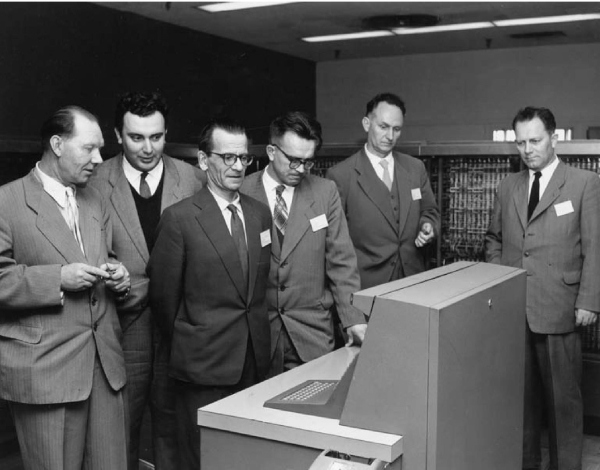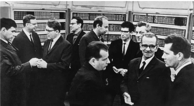 Генеральные конструкторы советских ЭВМ в США знакомятся с компьютерами IBM, 1959 год. Третий справа — Сергей Алексеевич Лебедев, далее по порядку Виктор Михайлович Глушков и Юрий Яковлевич Базилевский