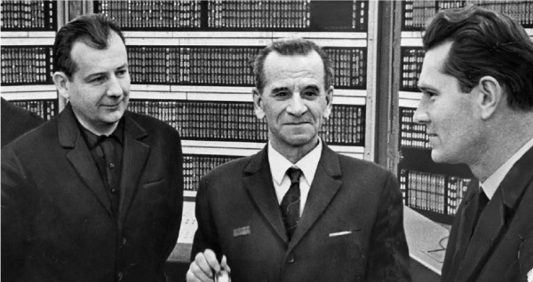 Участники разработки В. А. Иванов (слева), В. М. Семешкин и генеральный конструктор С. А. Лебедев на фоне БЭСМ-6